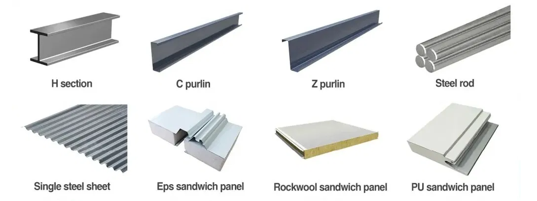 Main products: steel structural warehouse, workshop, high rise steel building, school, hotel,office building, exhibition building, show room, shopping mall, stadium,Agricultural project (stable/cattle barn, poultry house,pig house), car parking, hangar,shed,storage room, prefab house, container house, Sandwich panel,corrugated steel sheet, C&Z sec- tion steel, door and windows and cranes.